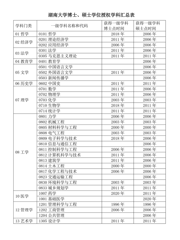 湖南大學博士、碩士學位授權學科匯總表(截至2020)